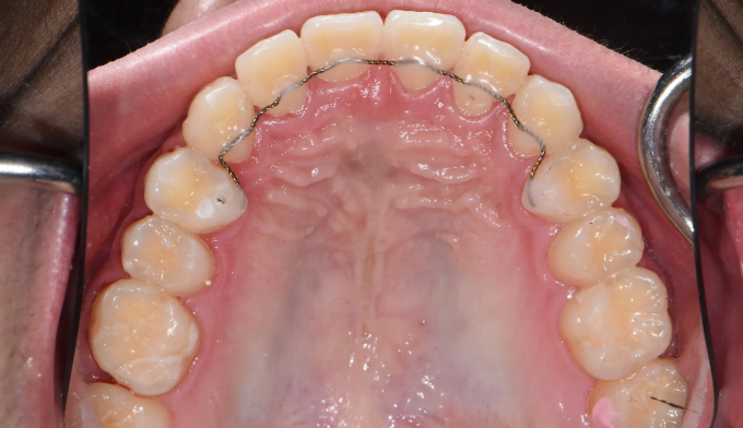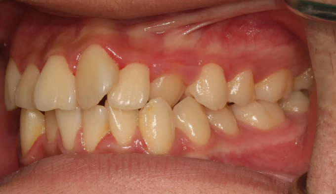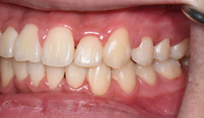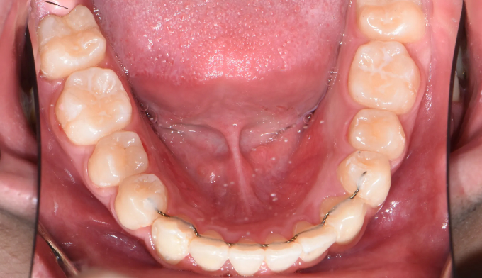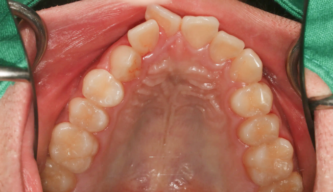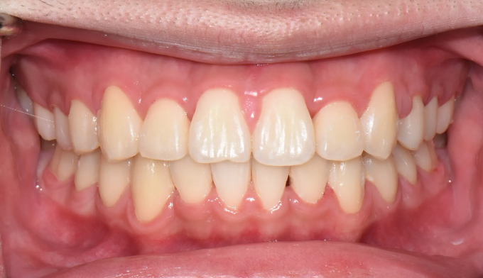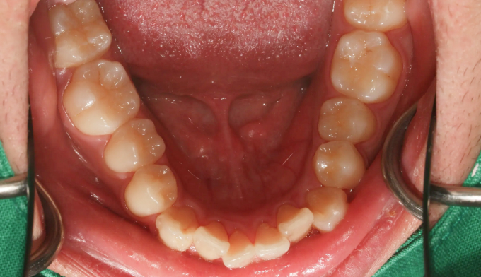 이번에는 악궁이 좁은 경우에 해당됩니다. 그 정도가 심해, 윗니 일부가 아랫니보다 안쪽으로 들어가있습니다.