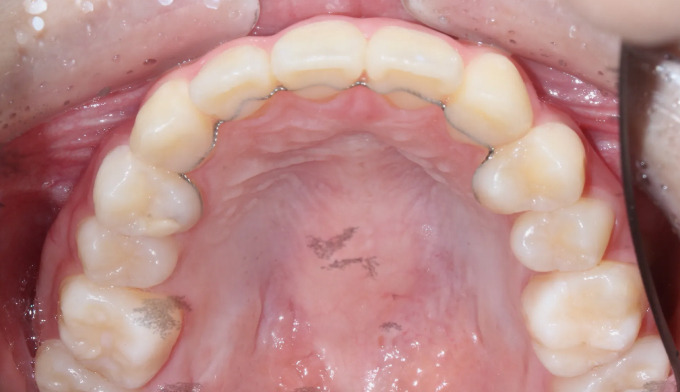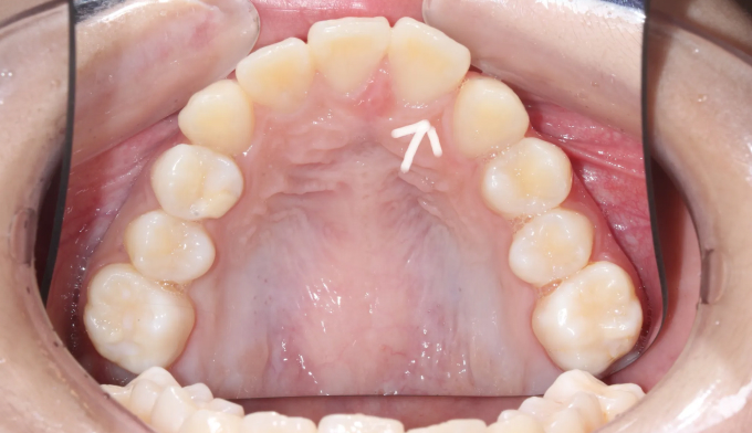 선천적으로 위 앞니 하나가 부족하여 치열이 틀어지게 된 경우입니다.(화살표 부위의 치아가 선천적으로 없습니다)